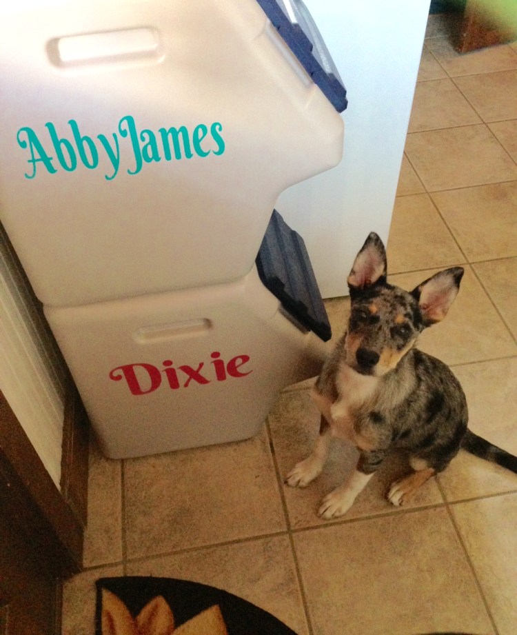 That face, her spots, those ears – too much cuteness all rolled into one little pooch! But the point of this post is really to share the personalized dog food containers she is proudly standing next to in our utility room.